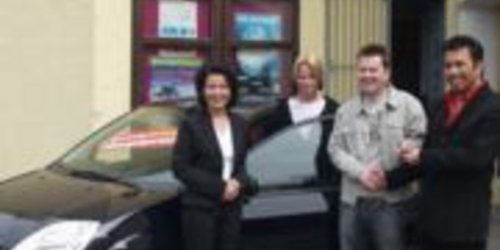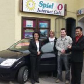 Trendy-Spieler glücklicher Gewinner eines Ford Fiesta